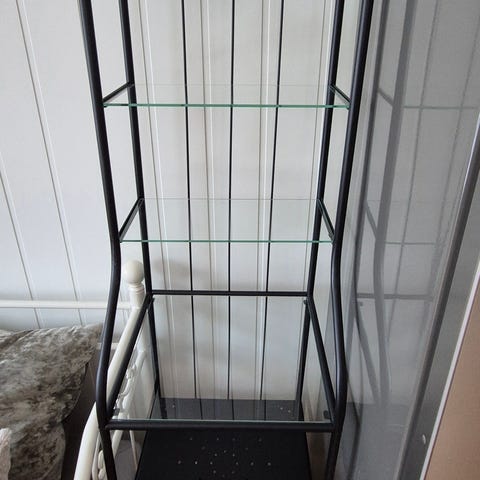 De fire øverste hyllene er av glass og de to nederst er av metall.
