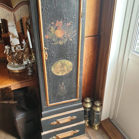 Mekanisk bordklokke i tre med klassisk utforming. Klokken har rektangulær kasse med buet topp, bærehåndtak og dekorelementer i metall på hjørner og føtter. Urskiven har romertall og dekorert bakplate. Baksiden har dør som gir tilgang til urverket i metall. Egner seg som bord- eller hylleklokke i stue, gang eller andre oppholdsrom.