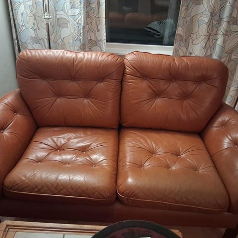 Toseter skinnsofa gratis mot henting. Mye sofa igjen, bare sitteputene som har begynt å flasse.