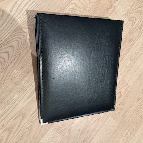 Selger 1 stk fotoalbum for scrapping i mørk brun tekstil, inkludert 14 plastlommer. Utvendig mål 38x32,7. 7 cm bredt.