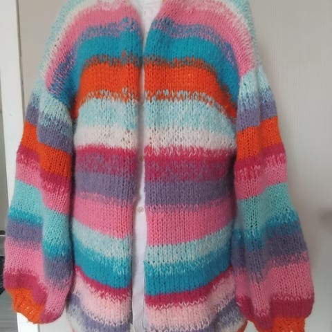 Fargerik og sjarmerende hjemmestrikket cardigan i blanding av ull, alpakka og mohair.