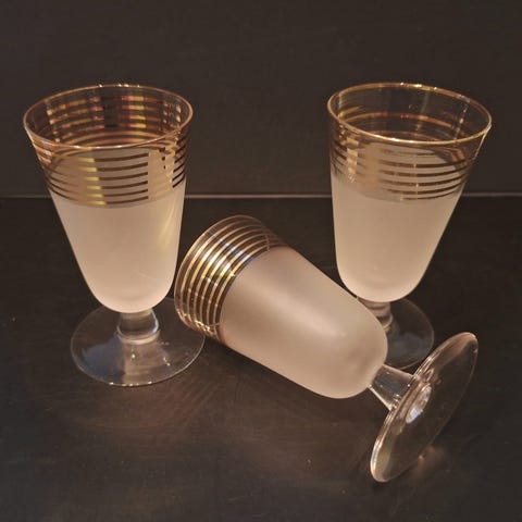 Tre stk. vintage frostet seltersglass fra Luminarch, Frankrike. Høyde 9 vm- De er i fin bruksstsnd. Sender gjerne. Prisen er for alle tre.