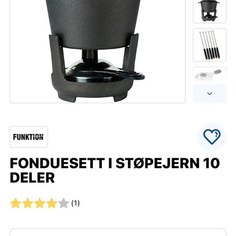 Gryte og lokk i støpejern, 6 fonduegafler, statv, brenner og trebrikke til å sette på. Aldri vært i bruk.