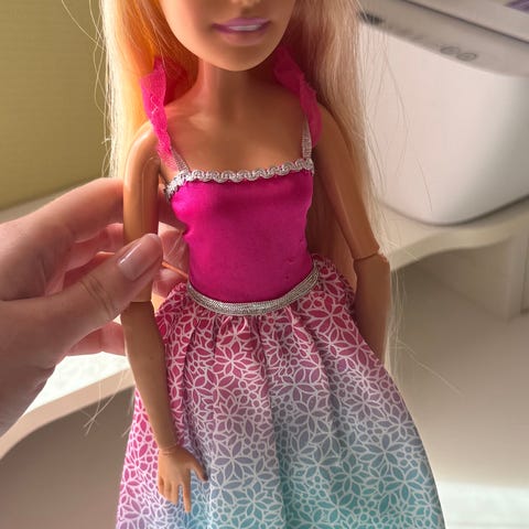 Barbie dukke med lang kjole i flerfargede regnbuemønstre og rosa tyllskjørt. Dukken har langt hår i lyse og rosa toner. Egnet som lekedukke for barn som liker rollelek og fantasifull lek med dukker og tilbehør.