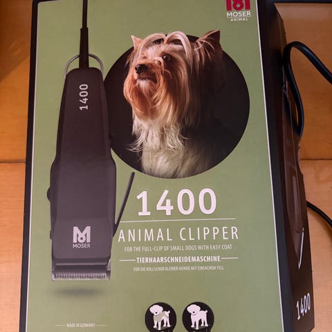 Selger Moser Max50, med fire ulike lengder på bladene (blader på 1mm og 3mm, samt klips man kan sette på, med 3mm og 6mm). Det ene bladet bør nok skiftes. Olje til bladene, og kjøle-/rensespray medfølger.