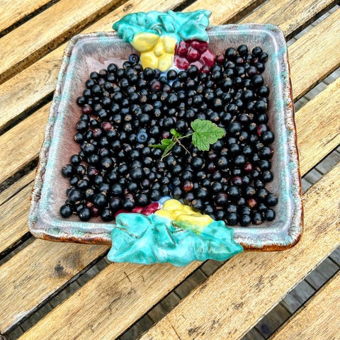 Har ei stor beige skaå med flere drue klaser ++ for salg . Størrelsen på sjølve skåla er 20 cm i diameter i toppen , diameter i bunn er 14 cm og høgda er 10 cm