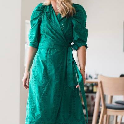 Selected Femme kjole i grønn farge, størrelse 40. Kjolen er laget i bomull og har et strukturert mønster i stoffet. Modellen har krage og knappestolpe foran, samt markert liv og vidt skjørt som går til over kneet. Ermene er trekvartlange med lett puff og strikk nederst. Passer som hverdagskjole eller til enkle, pene anledninger.