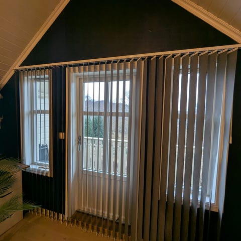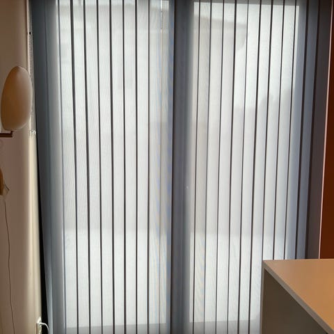 Hvite lamellgardiner i tekstil. Passer til store vinduer eller skyvedør. Gir mykt lys og skjermer for innsyn. Nå demontert.