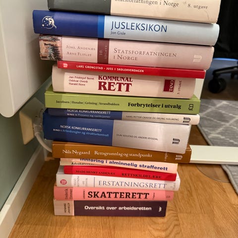 Se prisliste under. Samlet pensumsbøker for første året i rettsvitenskap. Avtale- og kjøpsrett, erstatningsrett, kontraktsrett, eiendomsrett, arv- og familierett (+ juridisk metode). Alle bøkene er meget pent brukt! Selger gjerne samlet for god pris. Kan møtes i Bergen sentrum eller sendes ⚖️