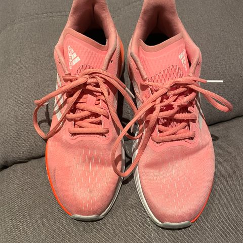 Adidas joggesko i størrelse 40 2/3. Skoene har blå overdel med hvite Adidas-striper og hælkappe. Overdelen ser ut til å være i semsket materiale med tekstilfôr. Sålen er flat og egnet til hverdagsbruk. Passer som fritidssko eller til lett aktivitet. Unisex ski.