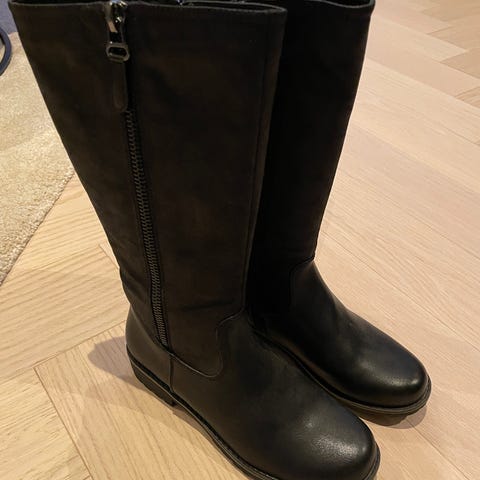 Bianco støvler, høye, i størrelse 38. Støvlene er svarte med spiss tå og middels høy hæl. Glidelås på siden for enkel av- og påtaking. Overdel i glatt materiale med skaft opp mot leggen. Passer til bruk i hverdagen eller til penere antrekk.