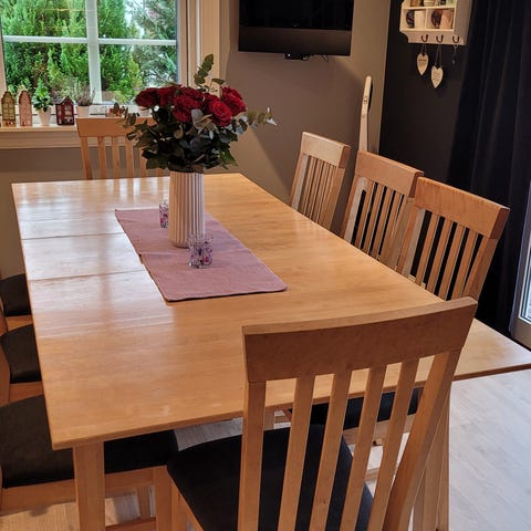 Pen mahogni spisestue med 6 stoler selges. Den har en løs ileggsplate. På bildene ser man bordet, både med og uten ileggsplate.