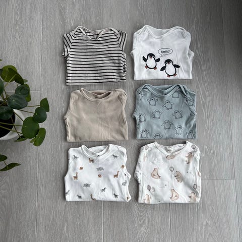 Newbie babyklær størrelse 80 unisex i flerfargede varianter. Pakken består av ulike overdeler og bodyer i myke tekstiler, flere med dyre- og naturmønster samt ensfargede plagg i nøytrale toner. Klærne passer til både jente og gutt i størrelse 80 og egner seg til hverdagsbruk. Flere av plaggene har trykknapper ved skulder eller foran for enklere av- og påkledning. Fra røyk- og dyrefritt hjem.