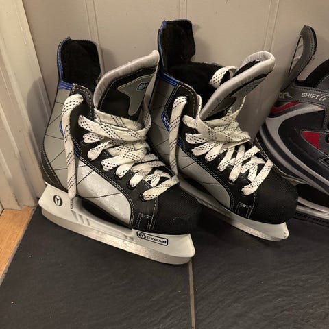 Canada 730 ishockeyskøyter for barn i størrelse 35. Skøytene har svart og hvitt yttermateriale med snøring foran og polstret ankelparti. Blad i metall med hvit holder. Egnet til ishockey og annen skøytebruk på is for barn med skostørrelse 35.