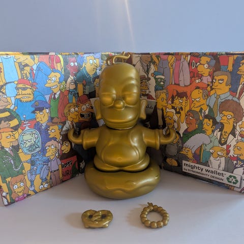 Søkeord: The Simpsons, Homer Simpson, Buddha figur, samlerfigur, TV-serie, gyllen statue, kultfigur, dekorasjon, humor, popkultur.