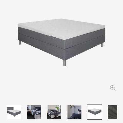 Koksgrå dobbeltseng Dreamzone fra Jysk, med sorte ben og ekstra sett ben i eik. Overmadrass på 5cm.