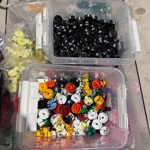 Selger en hel del plastmerker for å merke størrelser på klær.