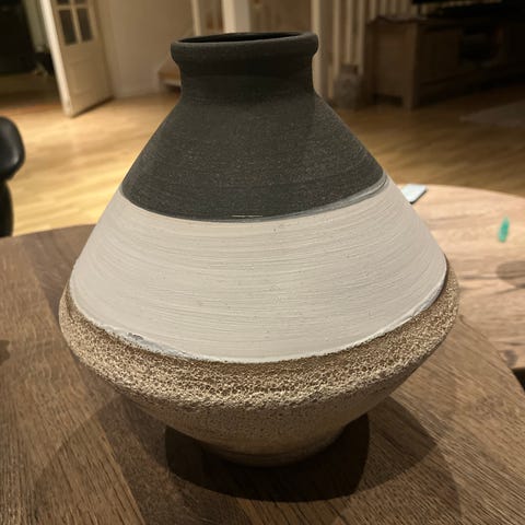 Gul og fin urne med flott mønster . Fin til strå eller andre tørke blomster da den ikke er glasert innvendig. Den er 32,5 cm høy ca. Og 15 cm diameter.