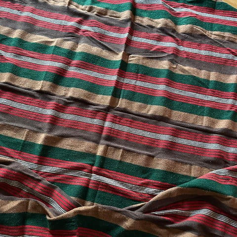 Stort, sjarmerende og hjemmelaget ullteppe i nydelige jordfarger, beige og brunt med røde og grønne striper innimellom. Godt og varmt og i god stand. Se bilder for detaljer.