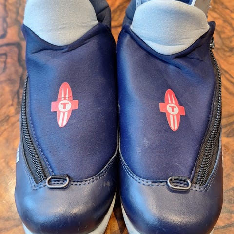 Alpina T5 Plus JR langrennsstøvler i størrelse 34. Modellen er en junior/langrennsstøvel. Støvlene har glidelås over vristen og snøring under for bedre tilpasning og støtte til foten ved klassisk langrenn.