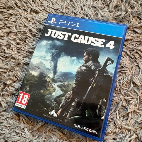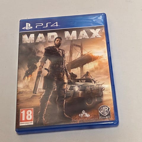Mad Max Playstation 4 spill. Actionspill satt i et postapokalyptisk univers der spilleren styrer hovedfiguren Max i åpne omgivelser. Spillet er på Blu-ray-plate i standard PS4-eske. Aldersgrense 18 år ifølge PEGI-merking på omslaget.