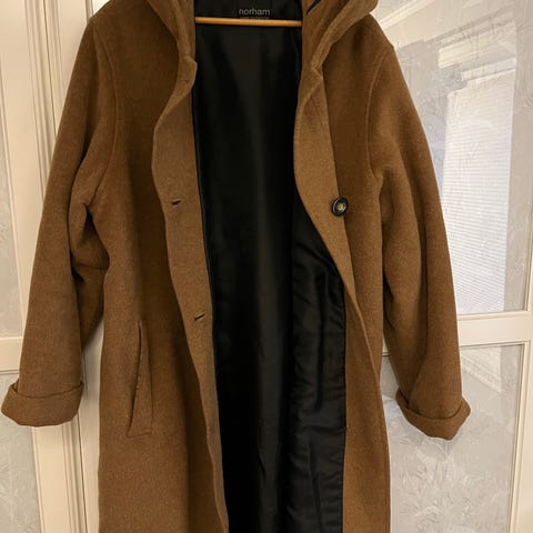 Gloverall original duffle coat . Dame str. Kåpen er rød og har hette samt treknapp-/ Innsiden har rutete fôr. Materialet er en ullblanding ( 80 % ull og 20 % nylon, ifølge vaskelapp). Kåpen har store frontlommer og middels lengde, egnet som yttertøy i kjøligere vær. Kjopt fra Gloverall i UK