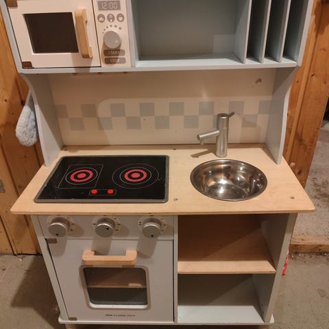 Nydelig lekekjøkken selges da vi har vokst fra det her. Det er i veldig god stand, med vask, stekeplate, stekeovn, og praktiske hyller til oppbevaring. Det følger med gryte, stekepanne, stekespader, og grytevott.
