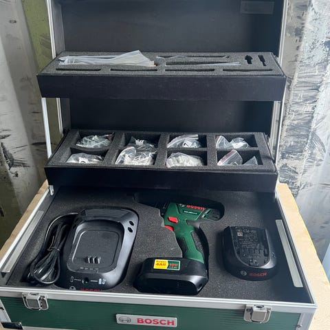 Bosch IXO skrudrill med koffert. Batteridrevet skrutrekker i kompakt utførelse, levert i plastkoffert. Settet inkluderer lader og dokumentasjon som vist på bildet. Egnet til mindre skrujobber i hjemmet, montering av møbler og annet lett arbeid der en liten og håndterlig skrudrill er praktisk.