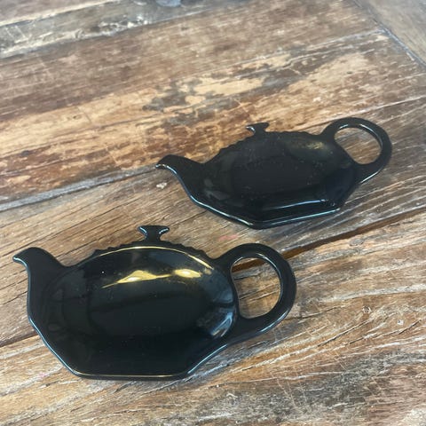 Le Creuset tekanneformet fat i keramikk. Små fat formet som tekanne, egnet som tesilfat, teposeholder eller liten serveringsskål. Fargene er svart og lys grønn. Laget i glasert steintøy/keramikk