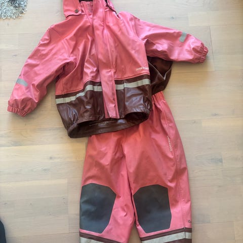 Jeg selger en vinterregnesett i størrelse 110. Grønn og rosa. Den trenger vask, men jeg har ikke hatt tid. Den ene trykknappen er ødelagt, men den er festet til en knapp på den andre siden, så den kan repareres. Det er ingen andre skader eller hull.