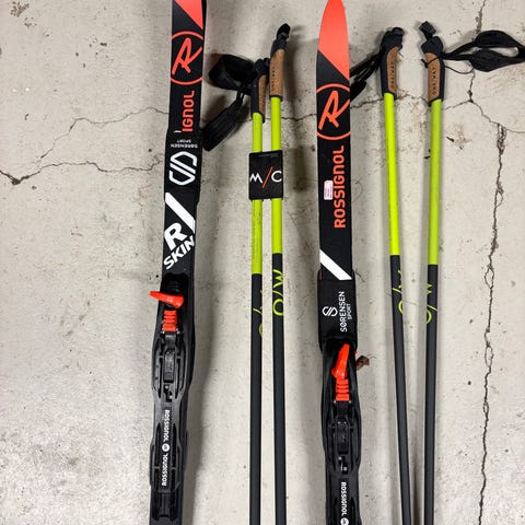 Rossignol RCS langrennski med bindinger i fargene hvit, svart og oransje. Skiene er klassiske langrennski med integrerte bindinger som passer til tradisjonelle langrennsstøvler med kompatibelt bindingssystem. Sålen er sort og jevn, og skiene har tydelig Rossignol-profilering på oversiden. Egner seg til bruk i preparerte langrennsløyper. Lengde 118 cm. Disse skiene er smøre ski.