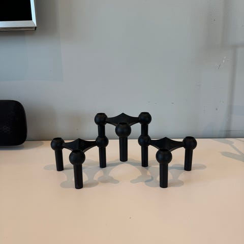 Stor og bred lysestake. 80 cm lang og 18 cm høy. Litt lakk er flasset av i de runde holdere til stearin.