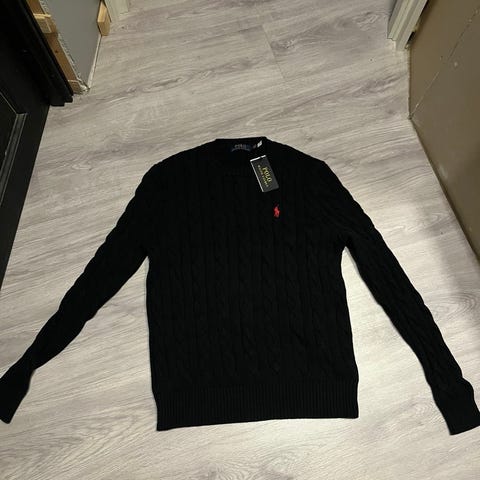 Ralph Lauren genser for herre i størrelse M. Genseren er blå og laget av bomull, med rund hals og kabelstrikket mønster. Passer til hverdagsbruk og kan kombineres med både jeans og chinos.