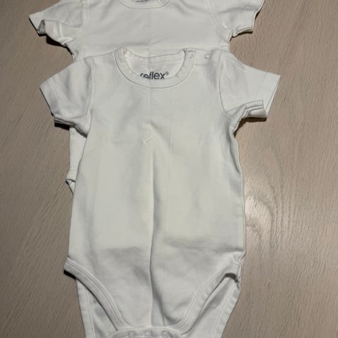 Helt hvite t-skjortebodyer. Usikker på om de ble brukt noen gang, vasket opp. Ingen flekker eller anmerkninger. Fremstår som nye. Fra røyk- og dyrefritt hjem.