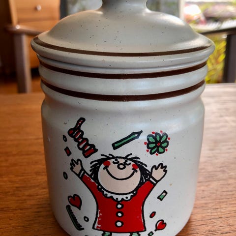 Svært lite brukt Arabia Moomin/Mummi kakeboks, fra Celebration-serien utgitt mellom 2012-2016. Designet av Tove Slotte. Rommer ca 2,2 liter, og er ca 26 cm høy med lokket på. Ingen skrammer eller merker. Samleobjekt!