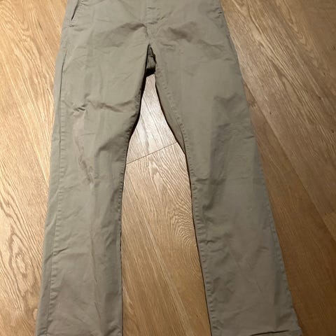 GANT chinos bukse for gutt i størrelse 176 cm. Buksen er i beige bomull med klassisk chinos-snitt. Den har beltehemper i livet, knapp og glidelåslukking foran, samt skrålommer i siden. Bak finnes to passpolerte lommer med knappelukking. Innsiden har vevd fôr med striper. Egnet som hverdags- og penbukse for gutt i høyde rundt 170-176 cm.