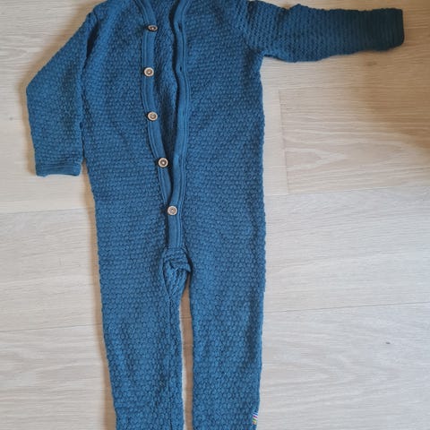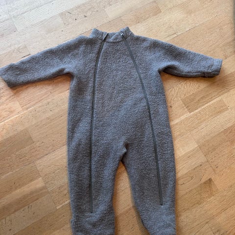 Joha ulldress i merinoull i grå farge for barn. Dressen har lange ermer og ben, og lukkes med knapper foran. Størrelse er oppgitt til 90 (ca. 86/92 på lappen). Materialet er 100 % merinoull.