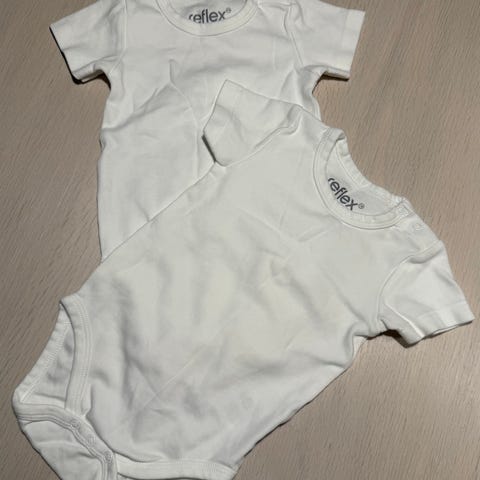 Helt hvite t-skjortebodyer. Usikker på om de ble brukt noen gang, vasket opp. Ingen flekker eller anmerkninger. Fremstår som nye. Fra røyk- og dyrefritt hjem.