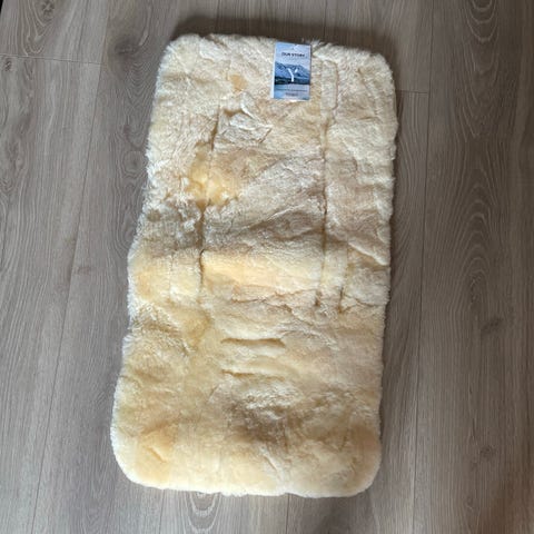Lammeskinn barnevognsinnlegg i beige farge. Mykt og varmt innlegg som legges i barnevogn for økt komfort. Oversiden er i lammeskinn, mens undersiden har glatt tekstil for stabilitet i vognen. Passer de fleste typer barnevogner med standard liggedel eller sittedel, avhengig av mål.