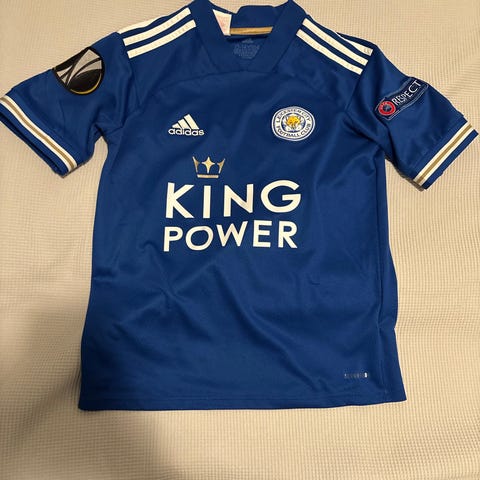 Den blå drakten er en Leicester City-drakt med klubbemblem og sponsortrykk foran. Også denne er kortermet i lett og pustende materiale, med Adidas-logo og striper på skuldrene.