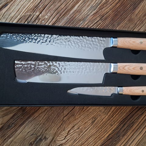 Helt ubrukt knivsett i koffert. Settet består av ulike kjøkkenkniver og tilbehør organisert i en hard koffert med bærehåndtak og låser. Knivene har svarte håndtak og leveres i egne plasser i kofferten for oversiktlig oppbevaring og transport. Egnet til generell matlaging og kjøkkenarbeid der man ønsker flere typer kniver samlet på ett sted.