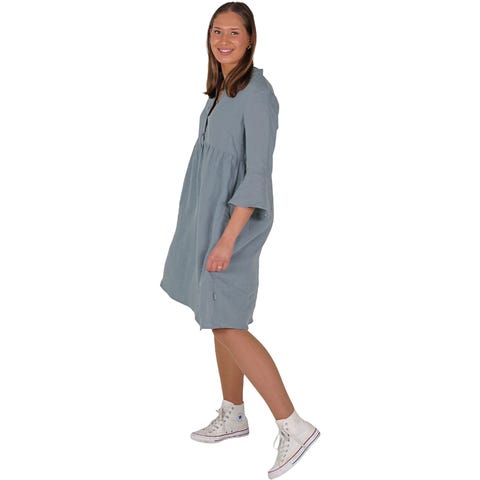 Nydelig skjortekjole fra KO:KO. Løs og ledig passform. 3/4 lange ermer med volanger. Kina-krage og knappestolpe foran. Lommer på hver side. Veldig pen blågrønn farge. Myk og kløfri lin. Nydelig sval på varme dager. En supersøt sommerkjole som er like fin til sandaler som sneakers!