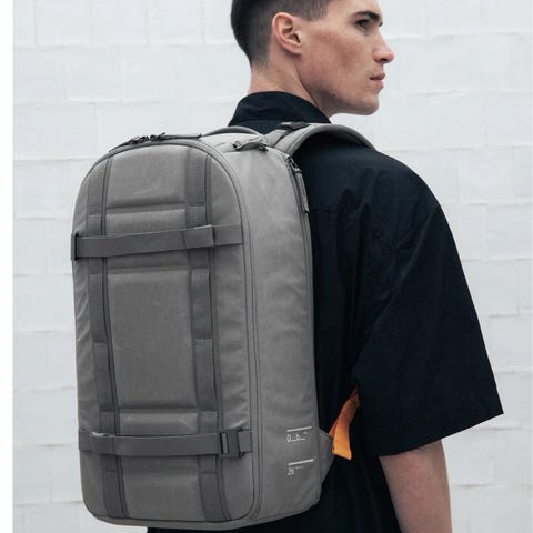 DB Rammverk ryggsekk i stoff . Sekken har et ensfarget, mørkt design med polstrede skulderstropper og bærehåndtak på toppen.
