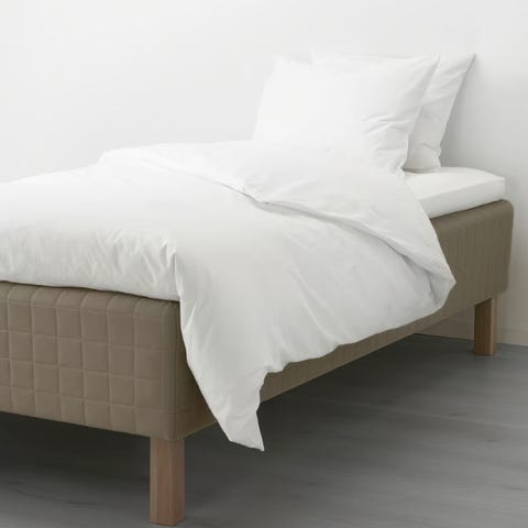 IKEA Skårer seng i grå tekstil. Sengen har polstret ramme med rutemønstret trekk og treben. Egnet for bruk med overmadrass eller madrass etter eget ønske.