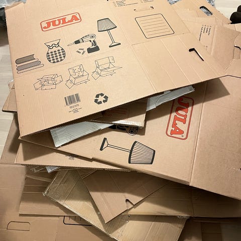 20 + stykker flytteesker i papp i størrelse large. Eskene er laget i kraftig papp og egner seg til flytting og lagring av diverse innbo og eiendeler. De har bærehåndtak og merkemuligheter på sidene for enkel sortering og organisering ved flytting eller oppbevaring.