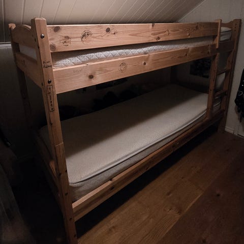 Loftseng med integrert skrivebord og garderobe. Sengen er plassert øverst med adkomst via trapp/stige på siden. Under sengen er det et skrivebord med skuffeseksjon med flere skuffer. Ved siden av er det garderobeskap med dører og åpne hyller for oppbevaring. Overflaten på skrivebordet har noen synlige merker og slitasje. Egner seg til barnerom eller ungdomsrom der det er behov for kombinert soveplass, arbeidsplass og oppbevaring i én løsning.