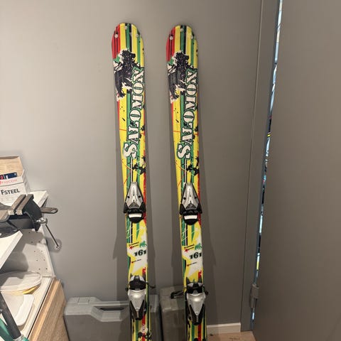 Skipakke til salgs. Salomon alpinski med integrerte bindinger. Skiene har twintip- fasong med oransje og grått design. Stålkanten er like hel hele veien rundt på begge ski.