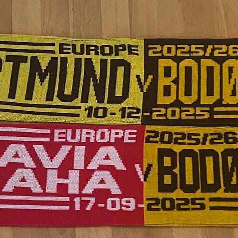 Selger et ekstra glimtskjerf som æ har med tittelen seriemester 24 og Bodø/Glimt på andre siden. Dette e et flott gullskjerf som kan hentes eller sendes via posten (Norgespakken) til 76 kr porto.