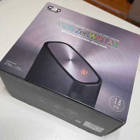 Routeren er en del av Asus ZenWiFi AX-serien og støtter WiFi 6 (802.11ax). AX6600. Den har flere Ethernet-porter på baksiden for kablet tilkobling av enheter, samt strømtilkobling og USB-port. Enheten leveres med strømadapter og nettverkskabler, samt et 3D-printet veggfeste slik bildene viser.