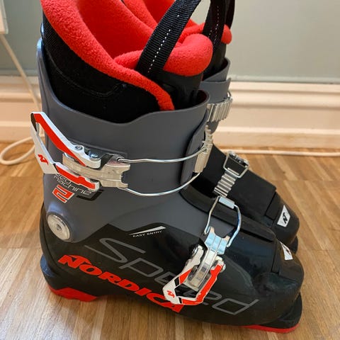 Nordica Speedmachine alpinstøvler for barn i rød og svart. Støvlene har justerbare spenner i metall og borrelåsreim øverst for god tilpasning rundt fot og legg. Modellen har tydelig polstret innersko med rødt fôr for komfort og varme. Yttersålen er laget for bruk med alpinski-bindinger. Vektjusteringsmulighet på støvelen. Egner seg til vanlig alpinkjøring for barn.
